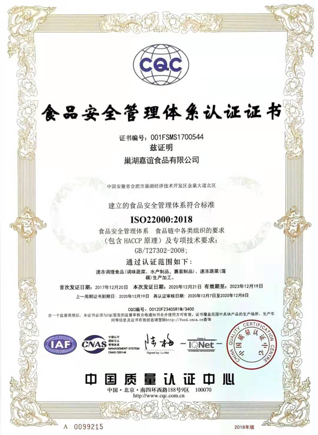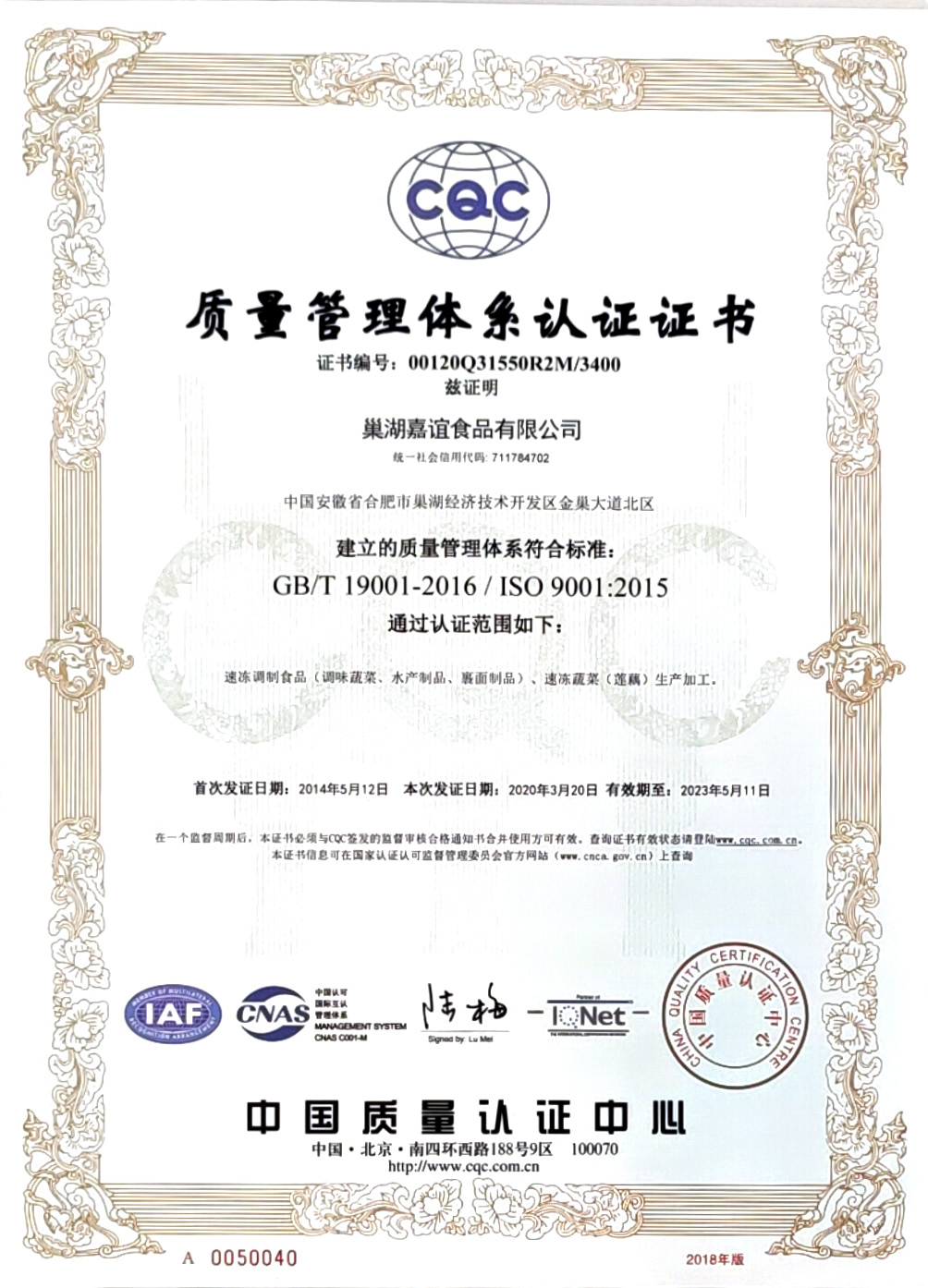 作為國家高新技術(shù)企業(yè)和安徽省農(nóng)業(yè)產(chǎn)業(yè)化龍頭企業(yè),多年來公司一直致力于農(nóng)產(chǎn)品精深加工業(yè)的發(fā)展,注重引進(jìn)國際領(lǐng)先的加工技術(shù)和管理理念。公司相繼通過HACCP食品安全管理體系、ISO9001、ISO22000質(zhì)量管理體系、ISO14001環(huán)境管理體系、ISO45001職業(yè)健康管理體系和原料基地GAP認(rèn)證。